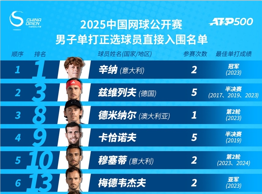 北京时间8月27日,中国网球公开赛正式向全球发布2025中国网球公开赛球员参赛阵容,包括男女世界第一辛纳和萨巴伦卡在内的14位大满贯冠军和5位曾登顶世界第一的球员将在9月14日至10月5日齐聚北京国家网球中心,和热情的中国观众一起活力登场! 世界前10出席5位辛纳领衔王者之争 作为美网后第一站最高级别、最受瞩目的男女合赛,此次中网男子选手直接入围名单中,世界前十中有5名选手出赛。202