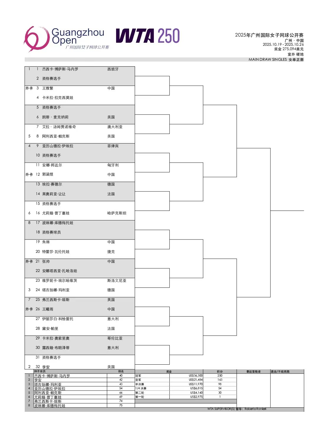 聚焦中国赛季:张帅领衔四朵金花出战,2025广网单打签表正式出炉!