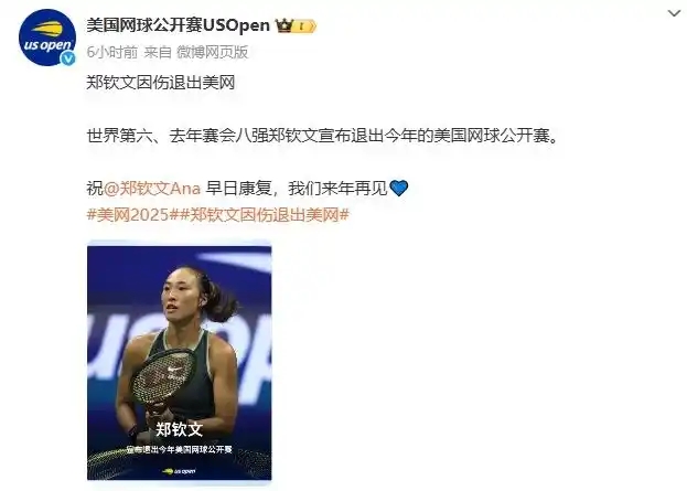 郑钦文因伤退出2025美网,将出战9月比利简金杯总决赛