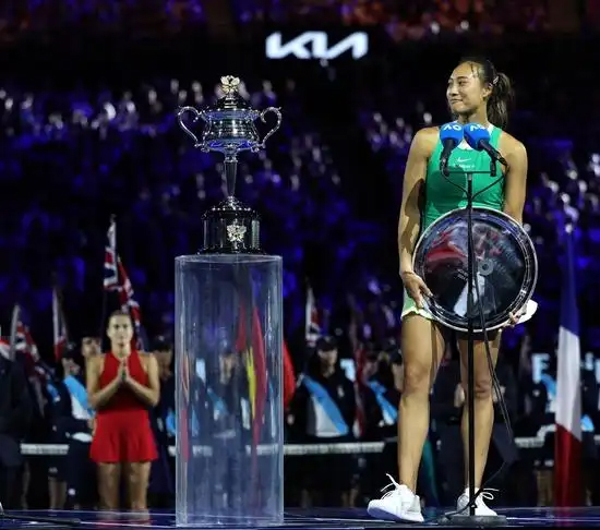 当地时间1月27日,澳大利亚墨尔本,2024澳网女单决赛后,获得亚军的中国选手郑钦文在颁奖仪式上。视觉中国供图 中青报·中青网记者慈鑫 2024年澳大利亚网球公开赛注定将成为中国网球历史上值得铭记的一页。中国选手郑钦文打进澳网女单决赛,并最终获得亚军。商竣程在男单比赛中闯入第三轮,创造了中国大陆男选手在澳网男单比赛的最佳战绩。此外,总计有多达9名中国选手跻身澳网男单、女单正赛,使得中国